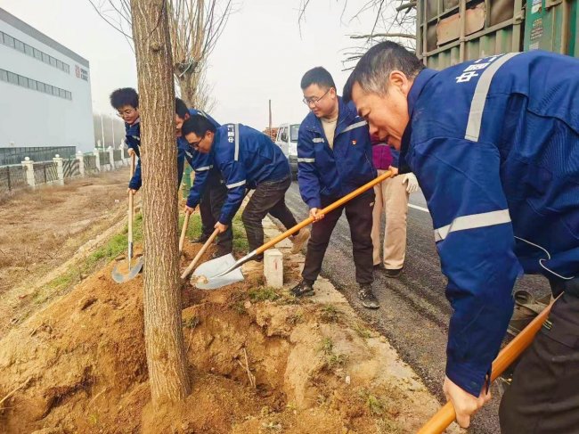 植树现场暖意融融、热火朝天,项目部职工们热情高涨、干劲十足,纷纷拿起铁锹、水桶等工具,迅速投入到植树劳动中。大家分工明确、默契配合,挖坑、扶苗、填土、踩实、浇水,每一道工序都做得有条不紊、细致严谨。挽起的衣袖、俯身的身影,勾勒出实干奋进的画面;奋力挥锹的力量、稳稳扶苗的细心,彰显着二冶人的责任与担当。劳作间隙,职工们相互帮扶、交流探讨,一边忙碌一边分享生态环保心得,畅谈企业绿色发展愿景,欢声笑语在春风中回荡,团队的凝聚力与春日的活力交织相融。