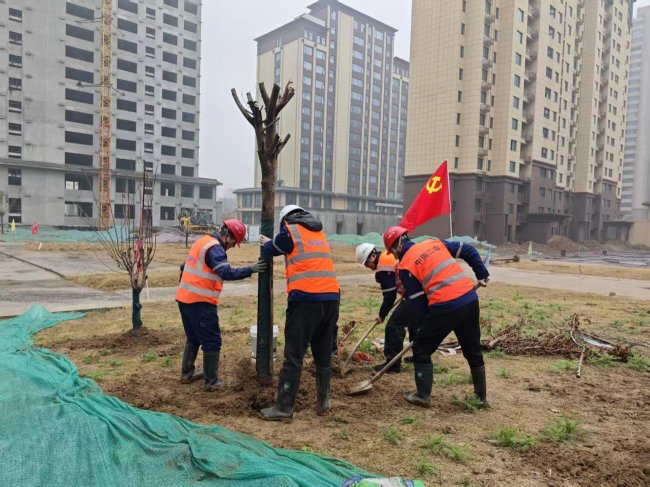 党建红引领生态绿,初心使命映初心。为将党建工作与生态建设深度结合,充分发挥基层党组织的战斗堡垒作用和党员的先锋模范作用,3月18日,湖南分公司虞城项目部党支部开展“党建引领添新绿,植树造林践初心”主题党日活动,组织全体党员及管理人员在项目施工现场开展义务植树,让党旗在植绿一线高高飘扬。